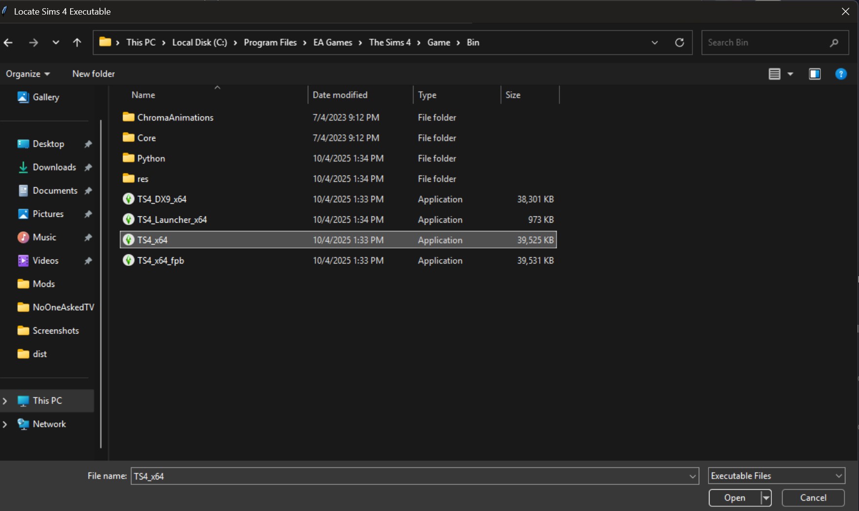 - Optionally, select the path to your TS4_x64.exe if config.exe isn't used